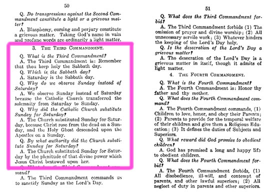 [You will also notice that this Catholic book refers to the Sabbath as the 3rd commandment, and not the 4th as given by God. This is because the Catholic system is the 'little horn' power (which followed the Roman empire), and it was prophesied that it would make these changes to God's set time (Sabbath) and laws (commandments); (Dan 7:25). Anyway, that is a whole other can of worms, which we won't go into here].