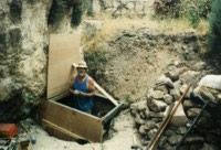 As they excavated along the cliff face, they came to a base of bedrock with some squarish holes. Ron surmised that they were cross holes. They were approximately 12 inches square and the central one was covered with a stone plug, apparently to keep debris from falling into the hole when it was not being used.
